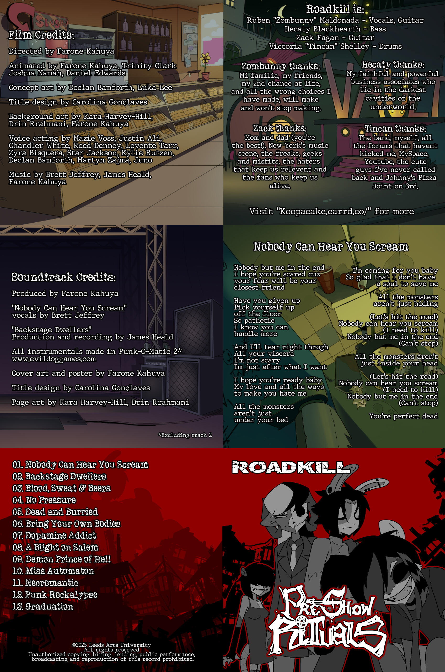 "Horror-Punk band Roadkill are about to headline their first show, and to ensure a flawless set, each member is given a simple task to be completed before the show starts. But, just their luck, a series of unpredictable events threatens their 30-minute deadline."